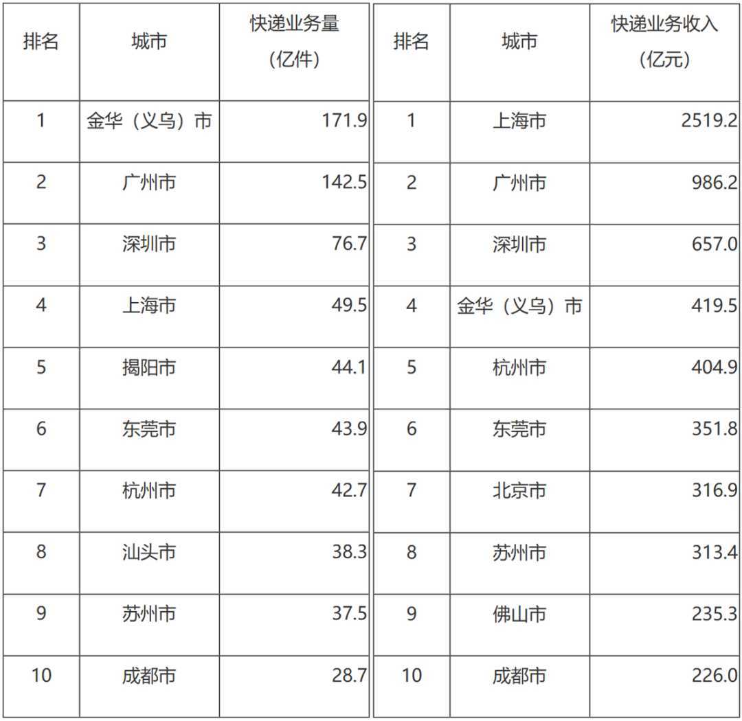 国家邮政局1月20日公布数据,2024年全国快递业务量累计完成1750.8亿件,同比增长21.5%。其中,金华(义乌)市快递业务量位居全国第一。