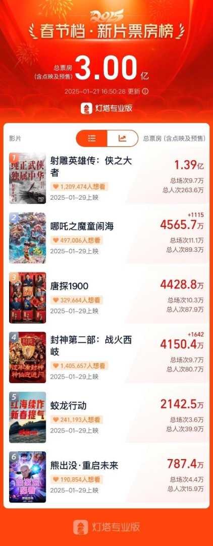截至2025年1月21日16时50分,2025年春节档上映新片预售总票房已突破3亿,彰显了国内电影市场的强劲复苏态势,预示着今年春节档将迎来一场观影盛宴。