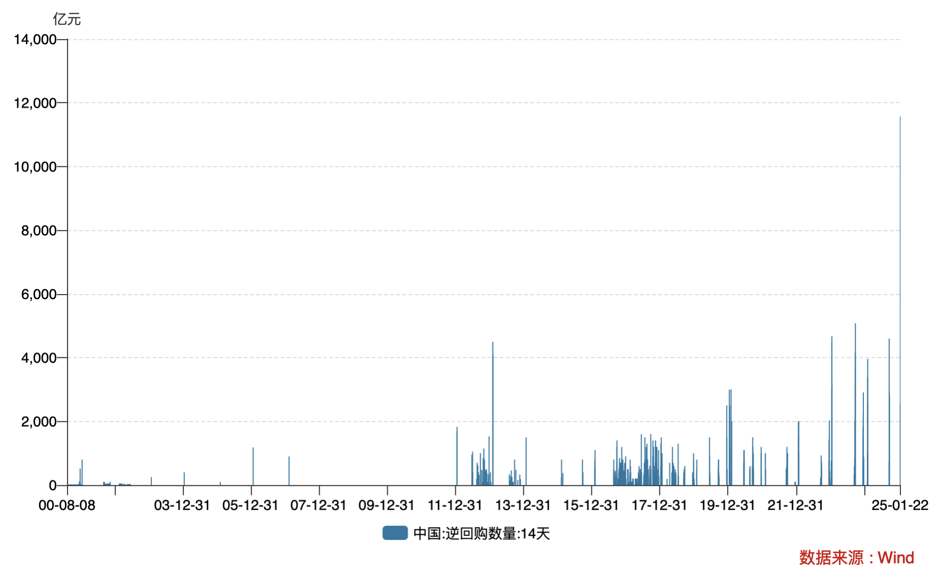 为有效应对这一局面,央行连续两日开展大规模14天期逆回购操作,累计投放近1.5万亿元流动性。其中,1月21日投放2560亿元,1月22日投放11575亿元。据Wind统计数据显示,此次11575亿元的14天期逆回购操作,刷新了历史纪录。