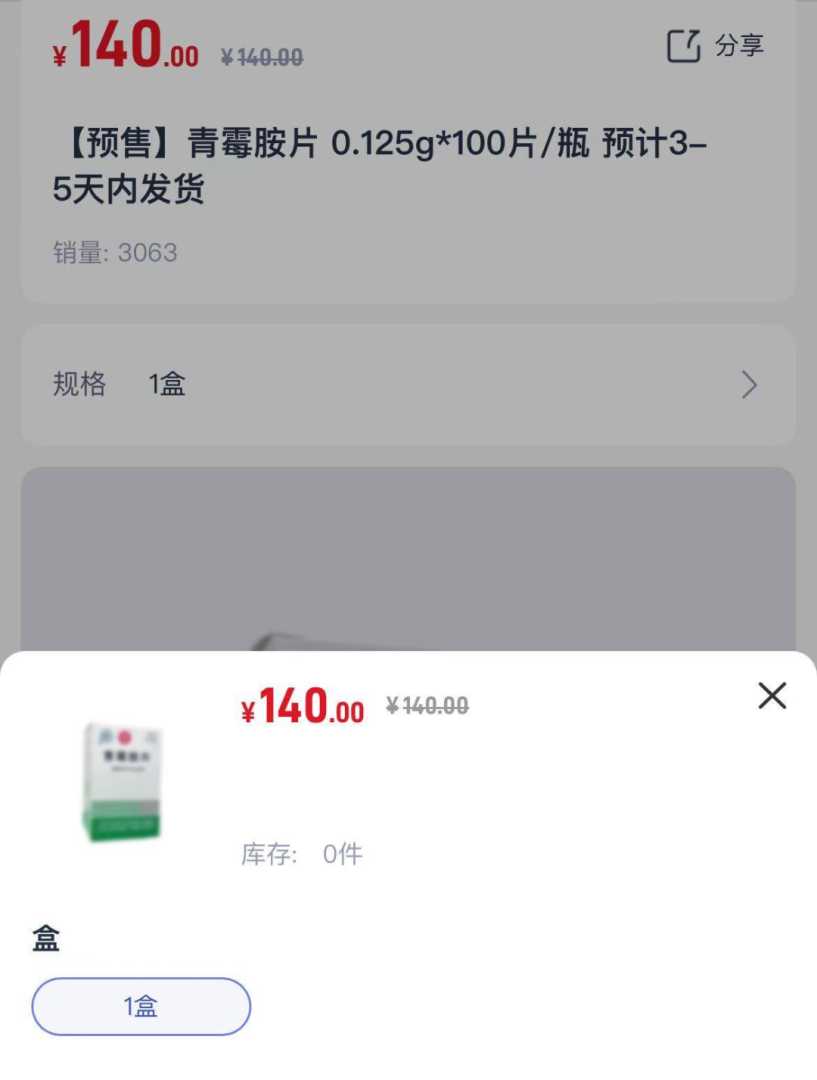 信谊药房小程序上的青霉胺片购买页面显示库存为0,且处于预售模式。