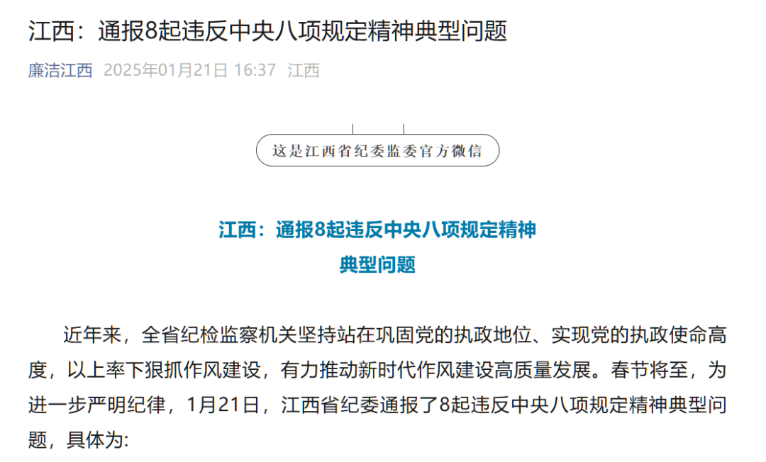 江西省纪委通报8起违反中央八项规定精神典型案例