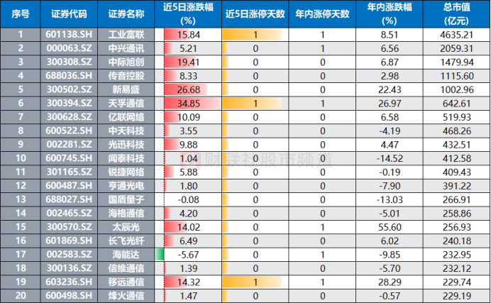 备注:近五日涨幅领先的中证全指通信设备指数成分股(截至1月22日收盘)