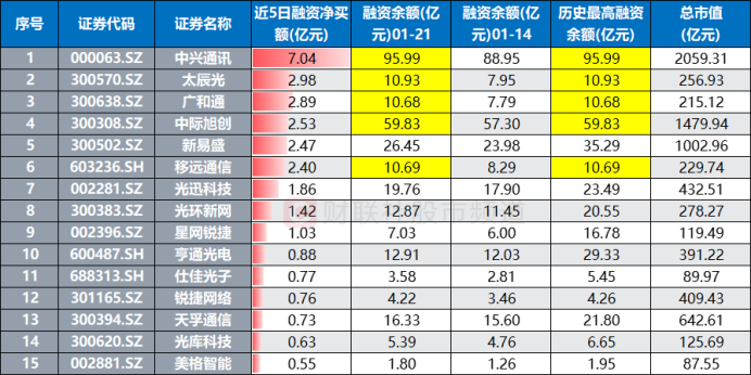 备注:近五日融资净买额领先的通信股(截至1月21日数据)