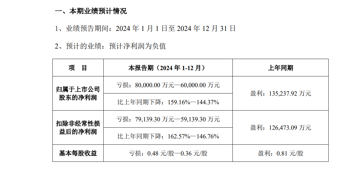 据公告显示,公司预计2024年度归母净利润为亏损8亿元至6亿元,而上年同期盈利为约13.52亿元,降幅高达159.16%至144.37%。扣除非经常性损益后的净利润预计亏损为7.91亿元至5.91亿元,上年同期盈利为约12.65亿元,降幅更是达到了162.57%至146.76%。