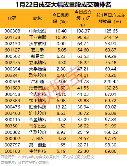 从个股成交情况来看,中际旭创、中兴通讯等科技龙头股今日成交额均超过百亿元,工业富联、东方财富、沃尔核材等成交额也超过50亿元。与1月日均成交额相比,中际旭创今日成交额放量高达126%,显示出市场对其的高度关注。据统计,今日成交额环比1月日均成交额放量幅度超过50%的个股超过400只,其中20只个股成交额超过20亿元。