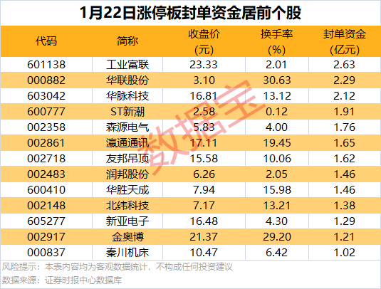 以封单金额计算,今日有13只个股涨停板封单资金超过亿元,其中工业富联、华联股份、华脉科技等个股涨停板封单资金较多,分别达到2.63亿元、2.29亿元、2.12亿元,显示出市场资金的追捧力度。
