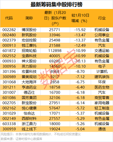 截至1月20日,已有333只个股公布了最新股东户数。与上期(1月10日)相比,股东户数下降的有149只个股,其中股东户数降幅超过5%的个股达到20只。在这些个股中,博深股份股东户数降幅最大,环比下降15.92%,新筑股份、宏创控股、钱江摩托等个股股东户数环比降幅也均超过一成,显示出筹码正在大幅集中。