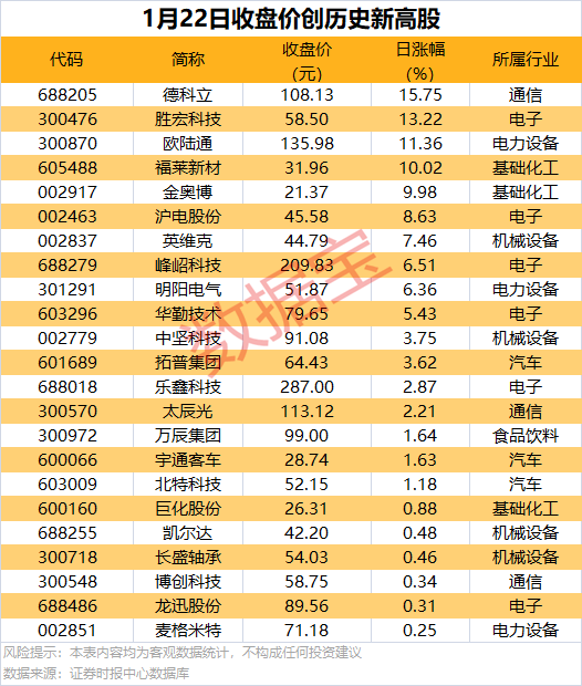在今日的股市交易中,不含近一年上市的次新股,共有23只个股收盘价创历史新高。从所属板块来看,主板有11只个股,创业板有7只个股,科创板有5只个股。从行业属性来看,电子、机械设备、汽车行业创新高的个股较为集中,分别有6只、4只、3只个股出现在名单中。这些个股的股价表现强劲,平均上涨4.97%,其中福莱新材、金奥博等个股涨停,德科立、胜宏科技、欧陆通等个股涨幅也居前。