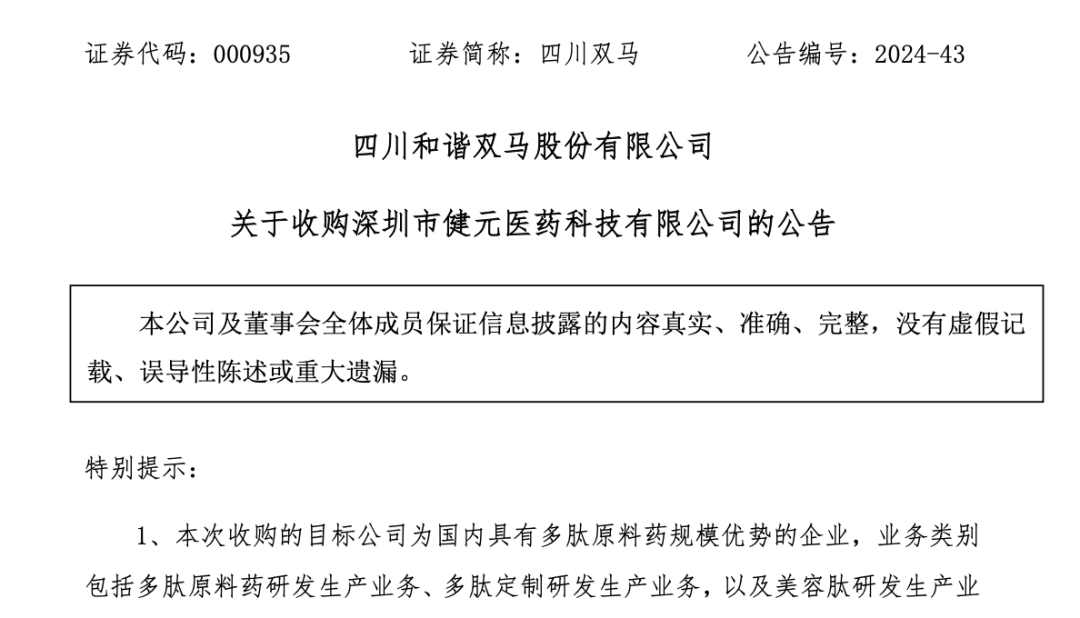 【导读】建材企业四川双马斥资16亿跨界收购多肽领军企业深圳健元,正式进军生物医药领域。