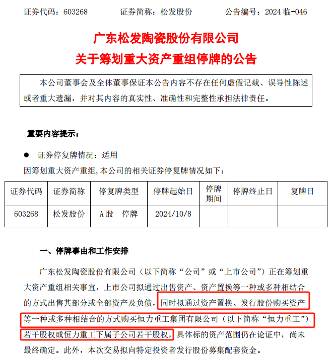 10月16日晚间,松发股份发布公告,宣布计划通过重大资产置换及发行股份购买资产的方式,全面收购恒力重工集团有限公司(简称恒力重工)100%的股权,并计划自10月17日开市起复牌。此举若成功,将成为A股市场又一“蛇吞象”式并购案例。