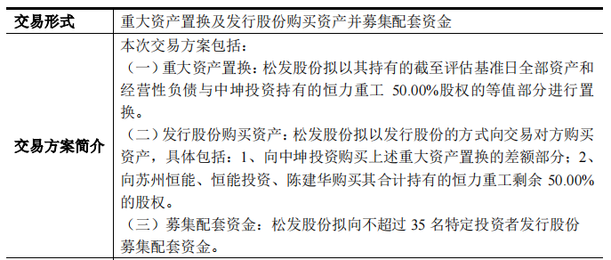 具体来看,松发股份此次交易方案分为三部分:一是松发股份拟以所持全部资产和经营性负债,置换苏州中坤投资有限公司所持恒力重工50%股权的等值部分;二是松发股份拟以发行股份方式,向苏州中坤投资有限公司购买上述重大资产置换的差额部分,并向苏州恒能供应链管理有限公司、恒能投资(大连)有限公司、陈建华购买其合计所持恒力重工剩余50%的股权;三是松发股份拟向不超过35名特定投资者发行股份募集配套资金。