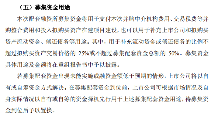 交易方案显示,松发股份此次拟募资配套资金,主要用途包含支付并购整合费用和投入置入资产在建项目建设,也可用于补充上市公司和置入资产的流动资金、偿还债务等。