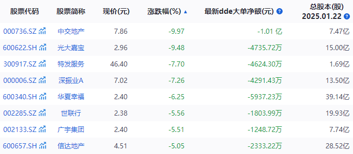 1月22日,房地产板块市场表现疲软,截至当日13时35分,中交地产(000736.SZ)股票跌停,光大嘉宝(600622.SH)跌幅超过9%,特发服务(300917.SZ)、深振业A(000006.SZ)等多只股票也大幅下跌,领跌房地产板块。