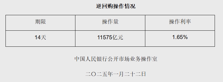 据中国人民银行官方网站发布的信息,为有效对冲公开市场逆回购到期、春节前现金需求增加等多重因素导致的流动性压力,中国人民银行于2025年1月22日实施了大规模的逆回购操作。此次操作以固定利率、数量招标的方式进行,投放了总额高达11575亿元的14天期逆回购,操作利率维持在1.65%的水平。