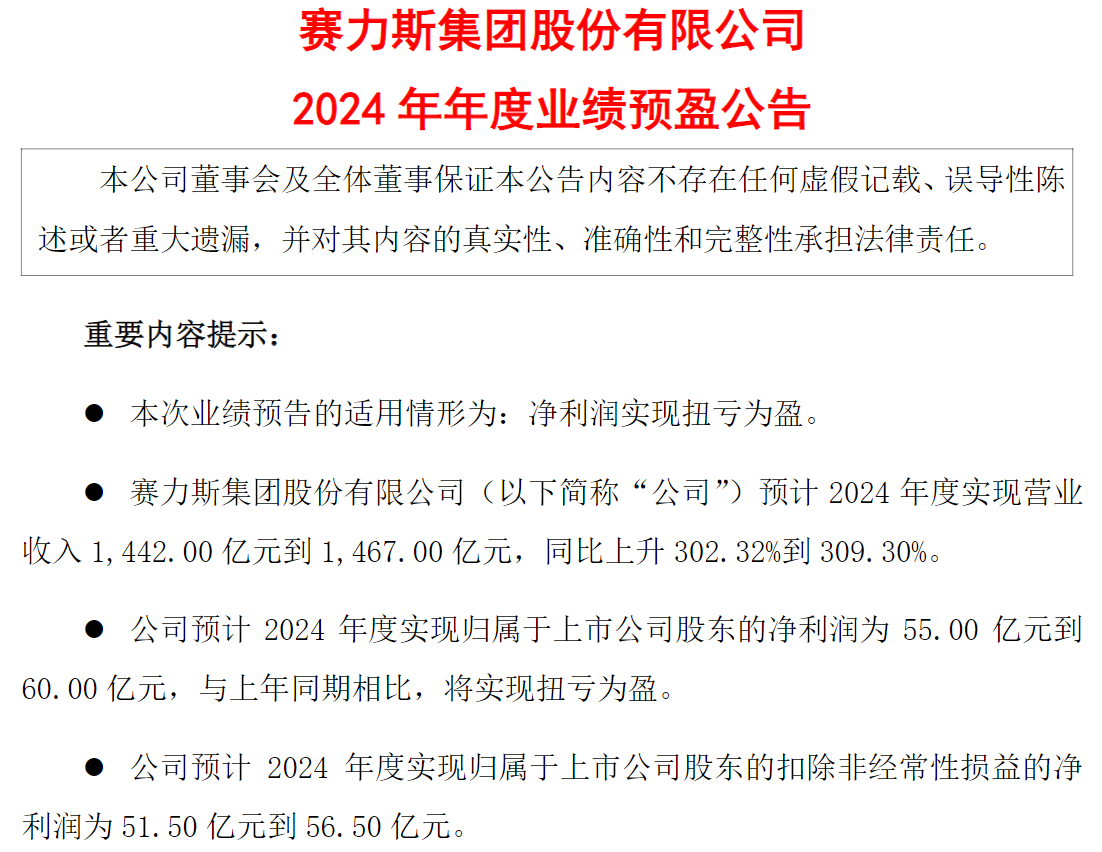 1月21日晚间,赛力斯发布公告称,预计2024年全年营业收入将达到1442亿元至1467亿元,同比增长302.32%至309.30%。更为引人注目的是,公司预计全年将实现归母净利润55亿元至60亿元,实现了从亏损到盈利的华丽转身。