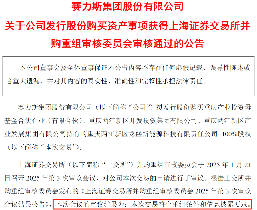 在同一晚的稍晚时候,赛力斯又披露了另一则重要公告。公司拟通过发行股份的方式购买重庆国资旗下的三个投资平台(重庆产业母基金、两江投资集团、两江产业集团)所持有的重庆两江新区龙盛新能源科技有限责任公司100%的股权(简称“龙盛新能源”)。该并购案已经获得了上海证券交易所并购重组审核委员会的审核通过。然而,值得注意的是,本次交易尚需获得中国证券监督管理委员会的同意注册后方可正式实施,因此仍存在一定的不确定性。