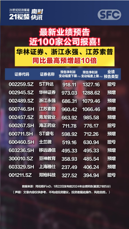 2025年1月22日,据统计共有98家上市公司发布2024年业绩预喜公告,其中预增57家,扭亏35家,略增6家。华林证券、浙江永强、江苏索普净利润增长超10倍,另有31家公司净利润增长超100%。