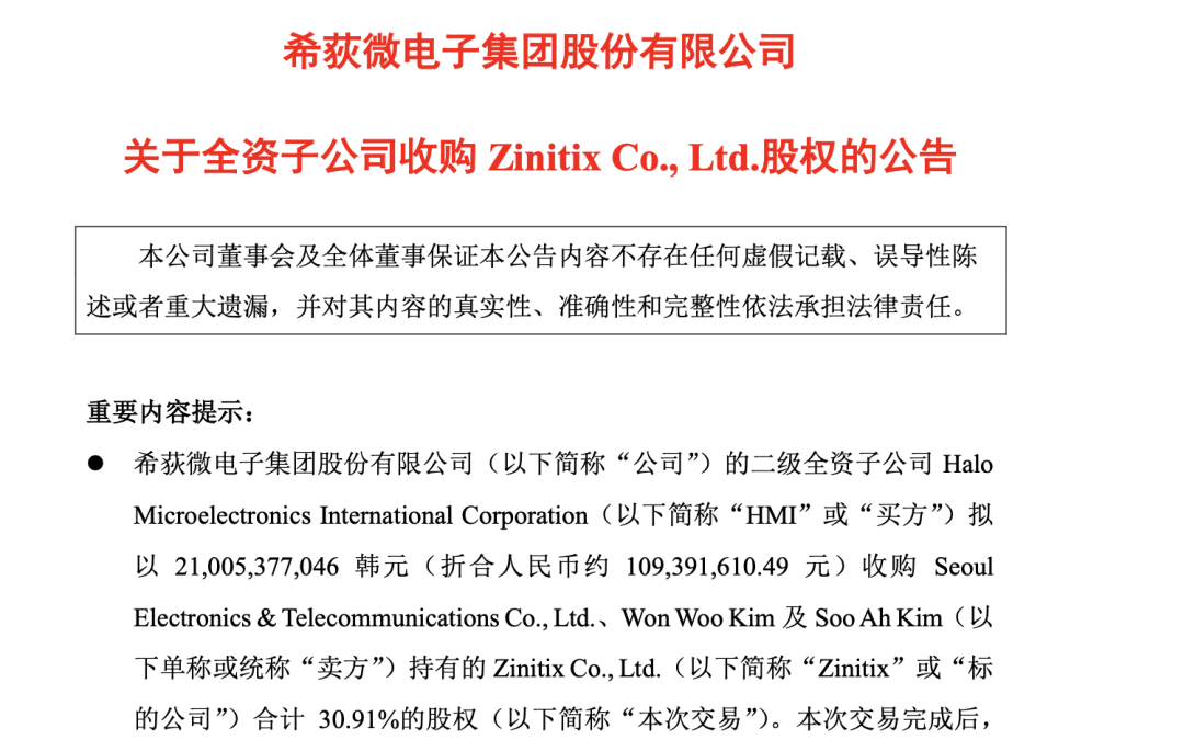 希荻微公告称,其二级全资子公司HMI将以约1.09亿元人民币收购韩国上市公司Zinitix Co., Ltd.的30.91%股权。尽管标的资产目前亏损,但希荻微认为此次交易将拓宽其技术与产品布局,加速产品品类和下游应用领域的扩张,进而增强持续经营能力和市场竞争力。