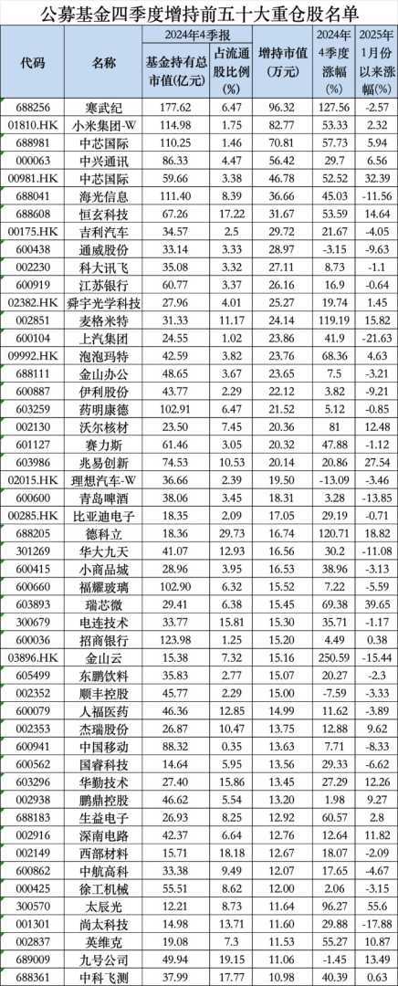 除了寒武纪外,小米集团、中兴通讯以及在A股及H股上市的中芯国际也被公募基金显著增持,位居公募基金四季度增持榜前五名。此外,金山云、德科立、麦格米特等四季度强势股也获得基金的青睐。
