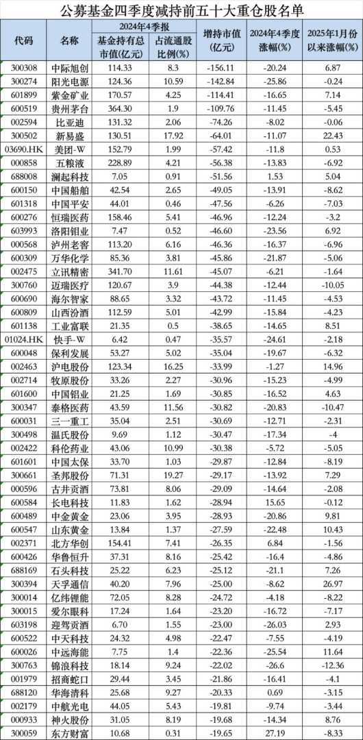此外,阳光电源、紫金矿业、比亚迪、新易盛、美团-W、五粮液、澜起科技、中国船舶等也进入公募基金四季度减持力度前十的个股之列。