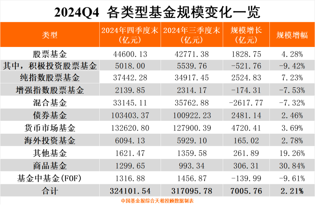 【导读】2024年公募基金四季度末总规模创新高,突破32万亿元大关,固收基金与纯指数股票基金成为增长引擎