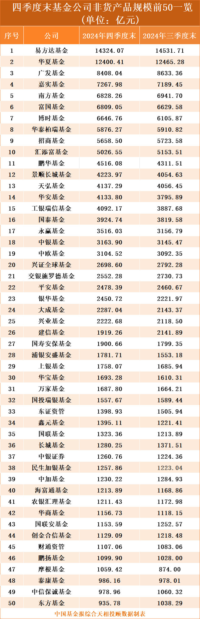 根据天相投顾数据,截至2024年四季度末,剔除货币基金后,共有47家基金公司规模超过1000亿元,尽管较三季度末减少了一家,但整体规模依然庞大。