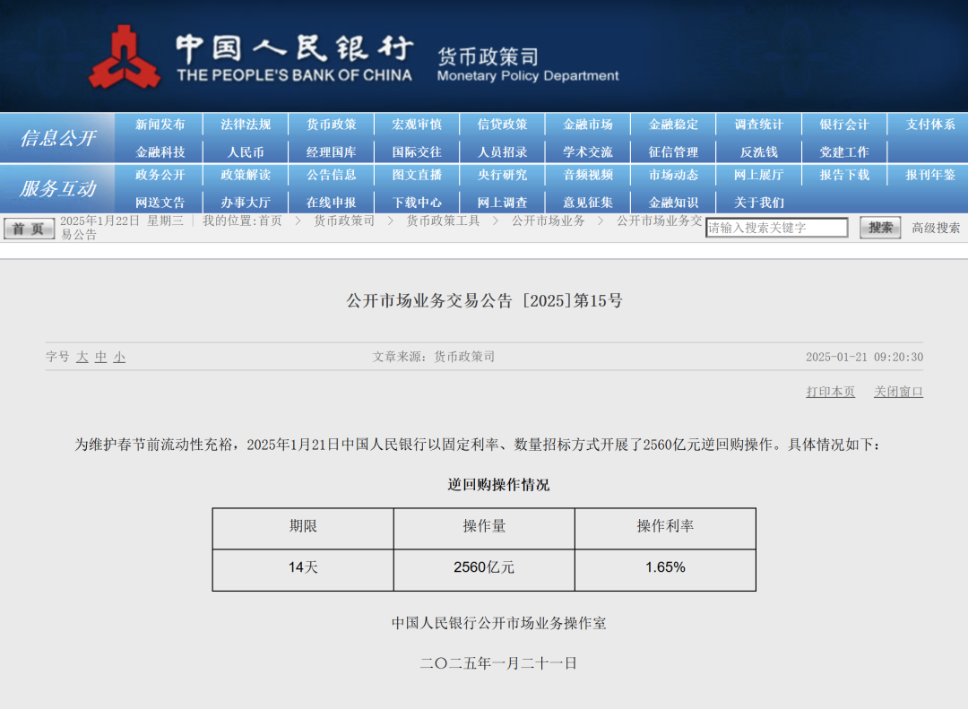 中国人民银行官方网站于今日(1月22日)正式发布消息,为了有效对冲公开市场逆回购到期以及现金投放等多重因素的影响,确保春节前市场流动性的充裕,中国人民银行于2025年1月22日以固定利率、数量招标的方式成功开展了规模高达11575亿元的逆回购操作,此次操作利率维持在1.65%,与上一次操作保持一致。