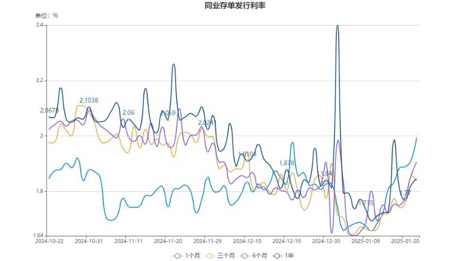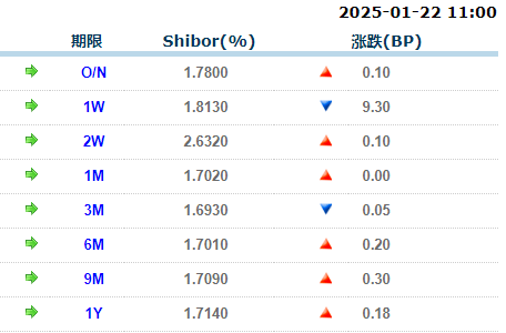 上海银行间同业拆放利率(Shibor)方面,7天期品种继续呈现小幅下跌趋势,而隔夜和14天品种则略有上涨。具体来看,隔夜Shibor上涨0.10个基点(BP),报收于1.7800%;7天Shibor下跌9.30个基点,报收于1.8130%;14天Shibor上涨0.10个基点,报收于2.6320%。(图表展示:上海银行间同业拆放利率(1月22日)
