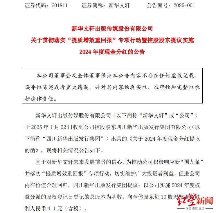 以新华文轩为例,该公司在公告中表示,此次分红计划旨在积极响应新“国九条”政策要求,落实“提质增效重回报”专项行动,切实维护广大投资者的利益,并推动公司内在价值的合理回归。