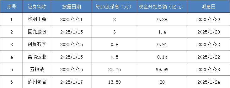 1月15日,白酒行业龙头五粮液公布了2024年中期的利润分配方案,以其现有总股本38,816,080,05股为基数,向全体股东每10股派发25.76元现金红利(含税),预计分红总额将达到99,990,222,20.88元(含税)。同样,该次利润分配也不涉及送红股及资本公积金转增股本。同日,创维数字、富临运业也公布了2024年第三季度权益分派方案。