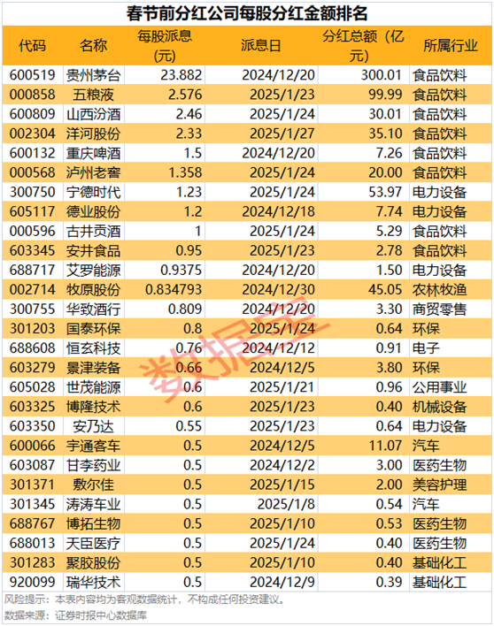 从每股派现金额来看,春节前实施分红的公司中,有27家公司的每股派现金额在0.5元及以上。其中,贵州茅台以每股23.882元的派现金额高居榜首,五粮液、山西汾酒、洋河股份等白酒龙头的每股派现金额也均在2元以上。