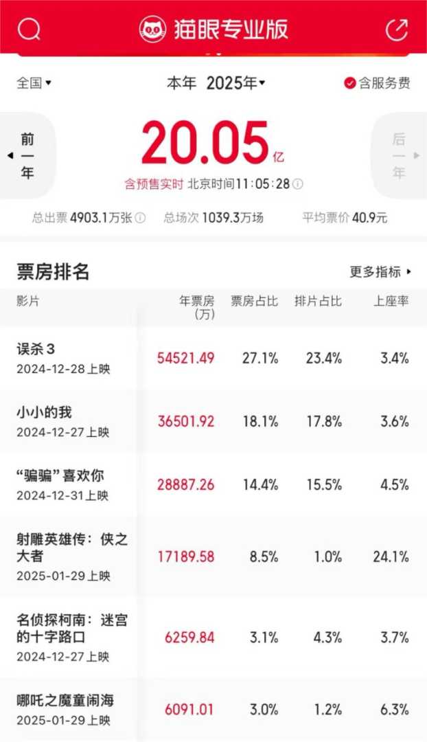 截至发稿时,2025年度电影票房已攀升至20.05亿元,总出票量达到4903.1万张,总场次高达1039.3万场,平均票价维持在40.9元的合理水平。