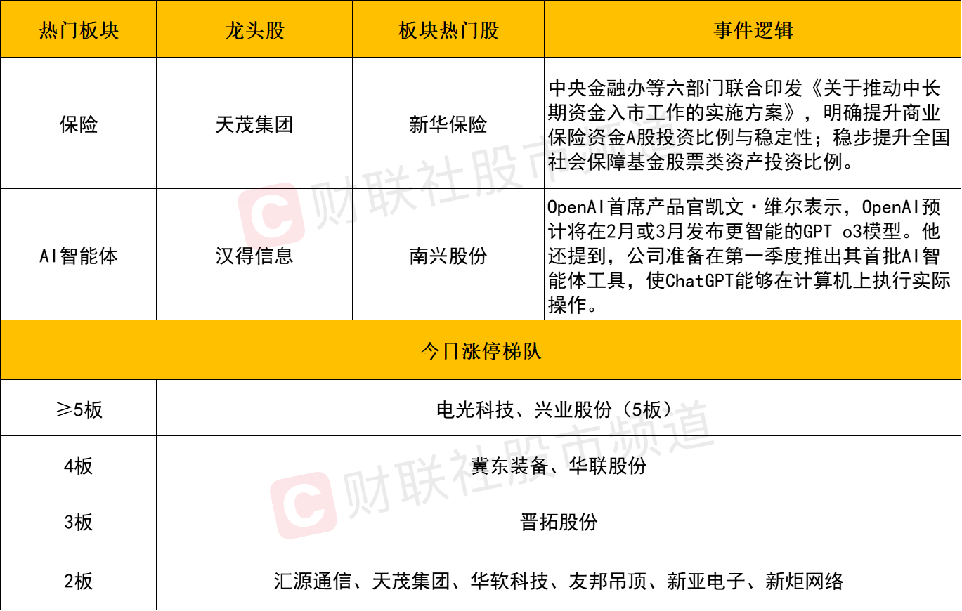 AI智能体概念股今日展开反弹,汉得信息涨幅超过17%,南兴股份、引力传媒涨停,新开普、金财互联、海天瑞声、值得买等个股也均有显著涨幅。此外,OpenAI首席产品官凯文·维尔透露,OpenAI预计将在2月至3月期间发布更智能的GPT-4模型,并计划在第一季度推出首批AI智能体工具,使ChatGPT能够在计算机上执行实际操作。这一消息进一步推动了AI智能体概念的反弹。然而,AI应用方向的延续性仍有待观察,因今日盘面显示,该方向更偏向于短线情绪博弈且缺乏领涨个股。
