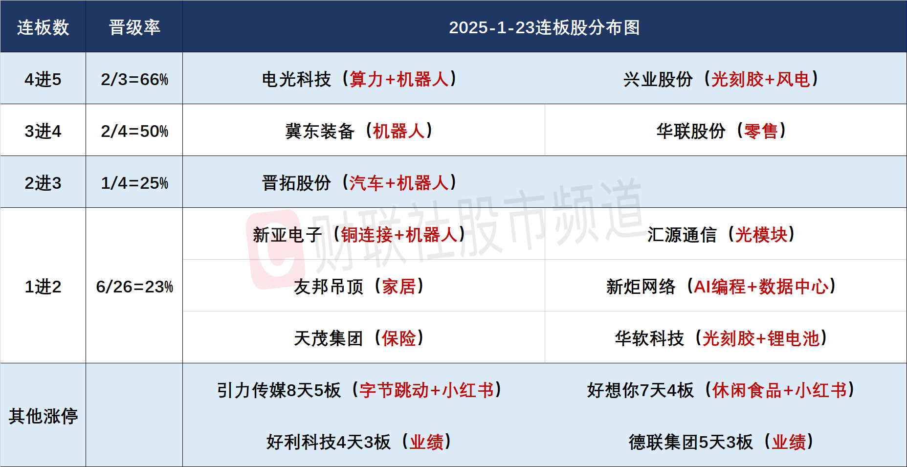 本文概述了A股市场在1月23日的震荡分化行情,连板股晋级率下滑,高位股出现回调。同时,AI智能体概念崛起,大金融板块受政策提振走强。文章还分析了机器人及算力硬件板块的表现以及后市展望与策略。