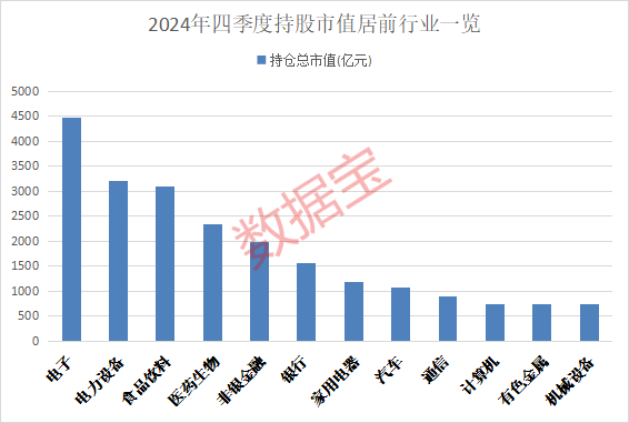 随着公募基金2024年四季报的陆续披露,基金重仓股浮出水面。截至2024年末,公募基金资产净值为31.83万亿元,其中持有市值最多的资产类型为债券,达18.87万亿元;股票持有市值紧随其后,为6.77万亿元,其中A股市值为5.89万亿元,虽较2024年三季度末略有减少,但仍显示出公募基金对A股市场的持续关注。据证券时报·数据宝统计,2024年四季度末,共有2930只股票现身公募基金前十大重仓股名单,其中电子行业持仓市值最高,达4465.8亿元,环比三季度末增长470.68亿元,显示出公募基金对电子行业的青睐。