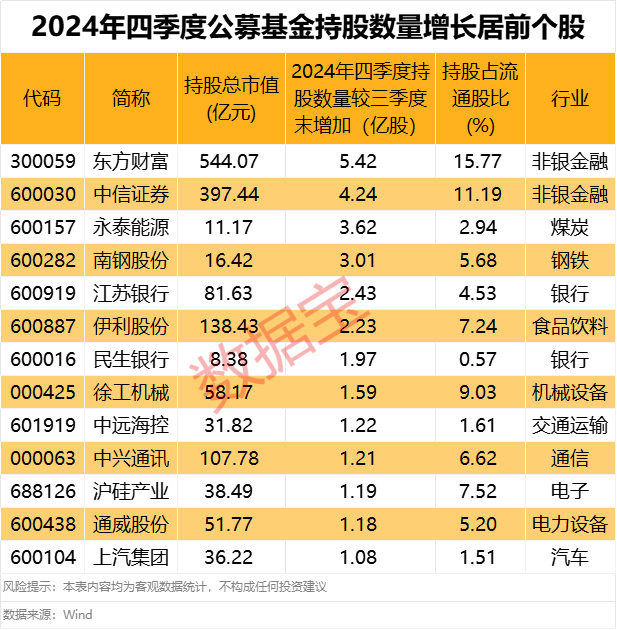 15股持股基金数量在2024年四季度增长超百只,电子行业持仓市值大增达4465.8亿元,公募基金布局显现。同时,高股息领域获得公募基金青睐,持股数量增长显著。市场热点切换频繁,投资者需谨慎应对。