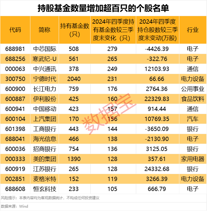 以持股基金数统计,获得超300只基金共同重仓的个股有29只,其中宁德时代、美的集团、贵州茅台、立讯精密分别有2040只、1390只、1125只、1115只基金共同持有。值得注意的是,15股的持股基金数量在2024年四季度增长超百只,中芯国际、寒武纪-U等个股持股基金数量大幅增加。虽然部分基金经理选择落袋为安,但整体而言,这些个股的市场关注度显著提升。