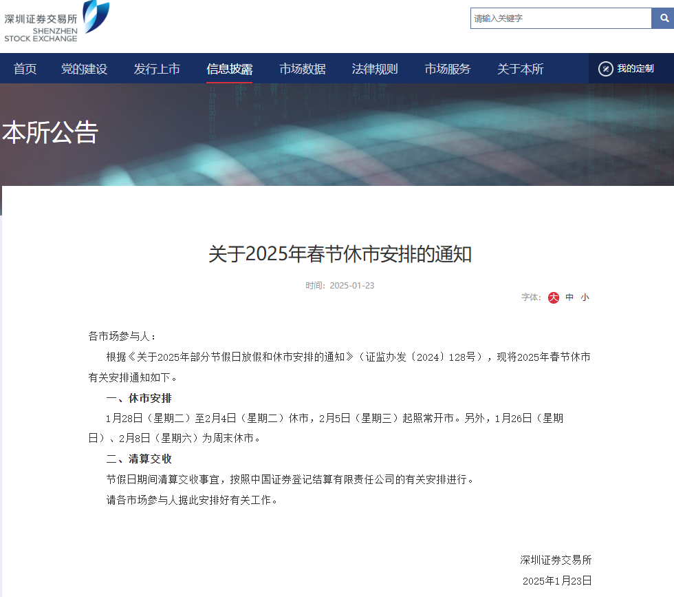 沪深北交易所联合发布了2025年春节假期休市安排通知,明确了交易时间规划。同时,沪深交易所还分别发布了沪港通、深港通下港股通交易日安排的通知,为投资者提供了明确的交易时间指导。