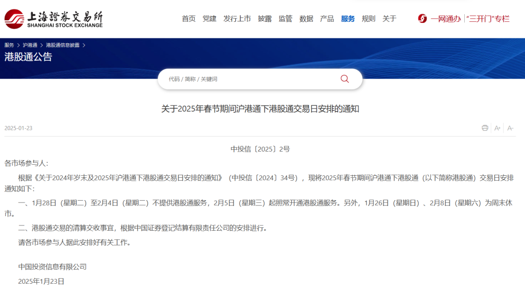 与此同时,沪深交易所还分别发布了关于2025年春节期间沪港通、深港通下港股通交易日安排的通知。通知指出,1月28日(星期二)至2月4日(星期二)期间,港股通服务将暂停,直至2月5日(星期三)起恢复正常。此外,1月26日(星期日)和2月8日(星期六)作为周末,也将被安排为港股通的休市日。港股通交易的清算交收等事宜,同样将根据中国证券登记结算有限责任公司的安排进行,以保障市场的有序运行。