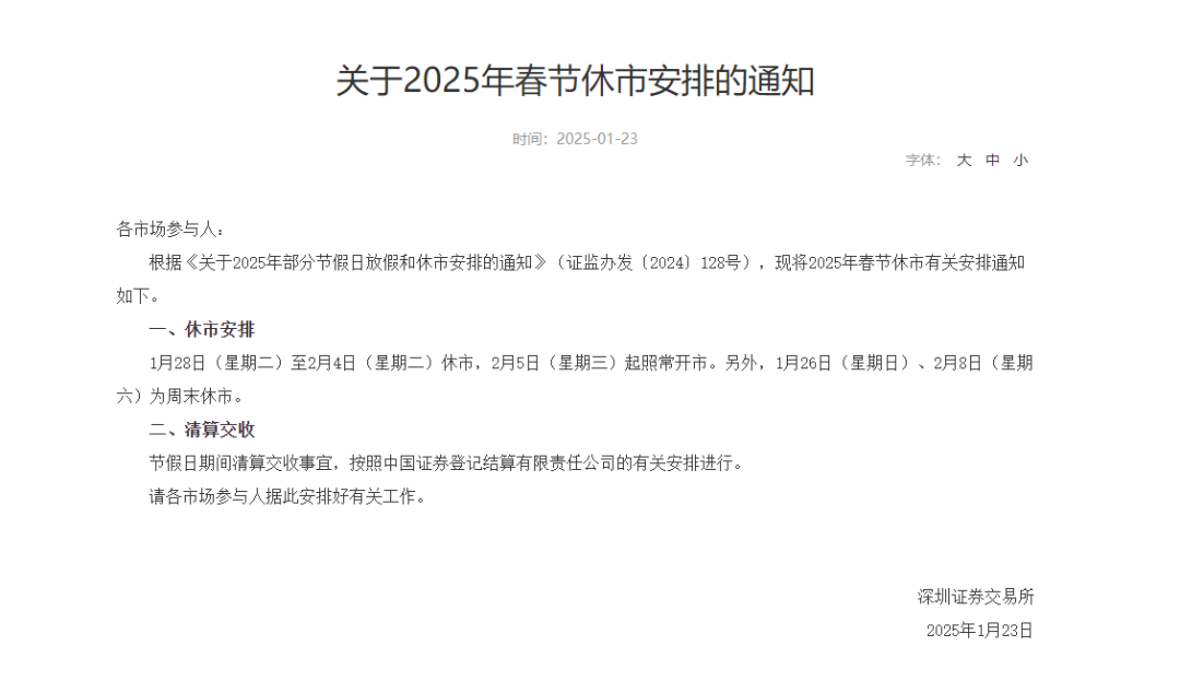 沪深北交易所及中国结算发布2025年春节休市及清算交收安排