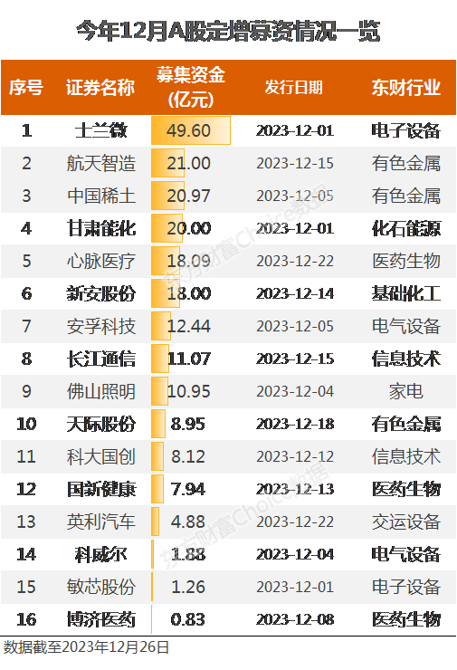 值得注意的是,尽管年内定增活动频繁,但募资规模下降的趋势仍在持续。12月A股市场仅有16家公司实施定向增发,募集资金215.97亿元,与2022年同期的1115.67亿元相比,缩水幅度高达80%。