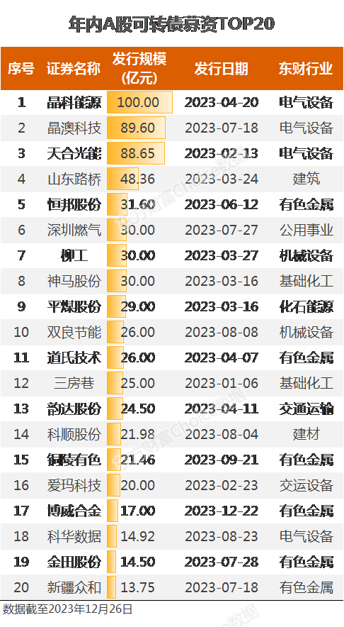 在可转债发行方面,晶科能源以100亿元的募资金额位居首位,晶澳科技和天合光能分别募资89.60亿元和88.65亿元。此外,山东路桥、恒邦股份、深圳燃气等5家公司发行可转债的募资金额也达到了或超过了30亿元。