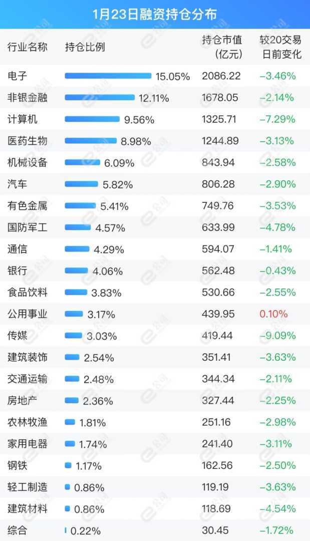 根据e公司的数据统计,截至1月23日,融资持仓市值排名前五的行业依次为电子、非银金融、计算机、医药生物以及机械设备,这些行业合计占持仓总市值的51.79%。