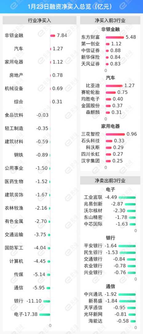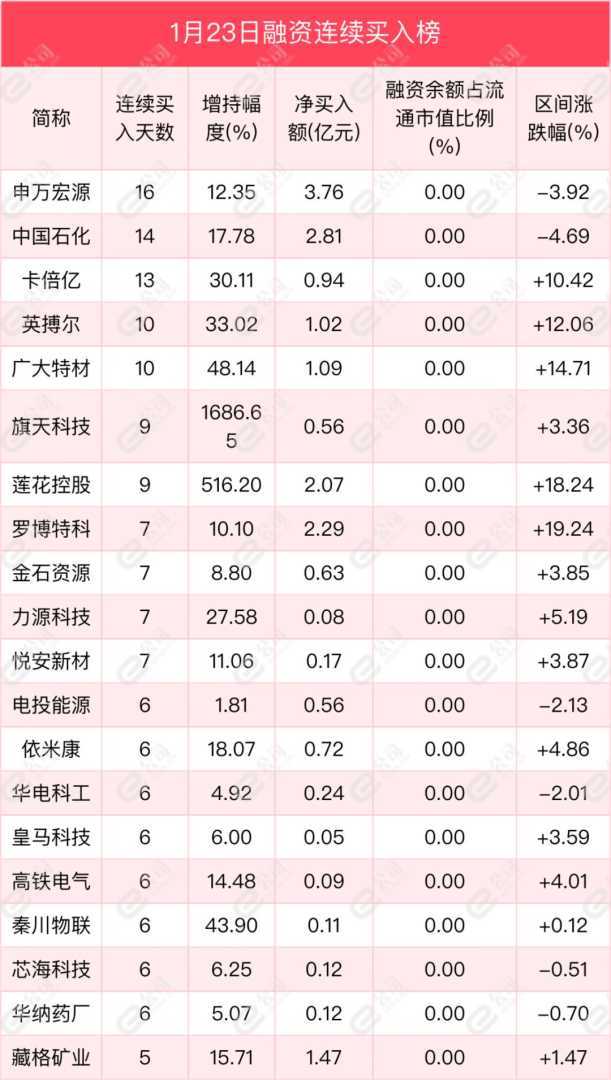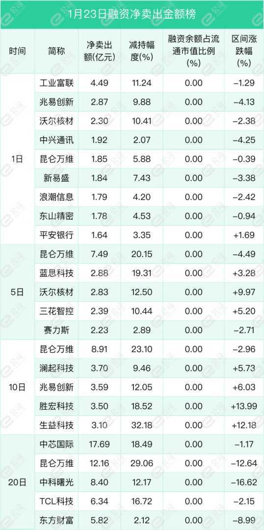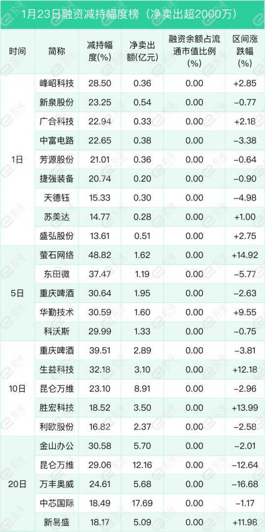 截至1月23日,A股市场融资余额合计减少51.66亿元,交易活跃度上升。电子、非银金融等行业持仓市值居前,传媒等行业持仓市值减少。个股中,申万宏源等获融资净买入,工业富联等遭净卖出。