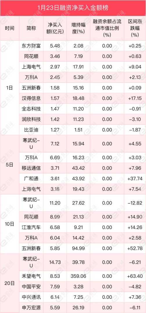 从买卖金额来看,东方财富、同花顺和上海电气获得了融资的大额净买入。东方财富的净买入额为5.48亿元,增持幅度为2.08%;同花顺的净买入额为3.46亿元,增持幅度为7.19%;上海电气的净买入额为2.97亿元,增持幅度高达17.91%。