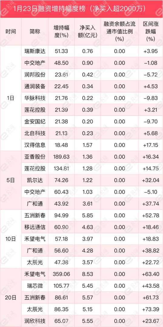 在增减持幅度方面,单日净买卖超过2000万元的个股中,瑞斯康达、中交地产和润邦股份获得了显著的融资增持。瑞斯康达的增持幅度达到51.33%,中交地产为48.5%,润邦股份为23.61%。
