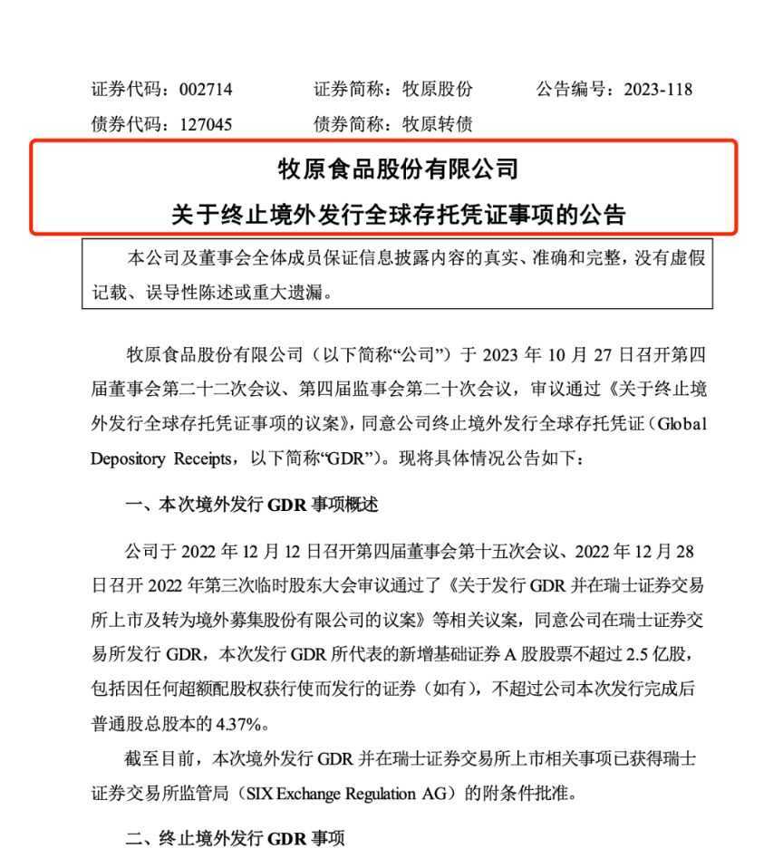 筹备长达10个月的境外发行全球存托凭证(GDR)计划,牧原股份的海外上市之路却突然受阻。10月28日,牧原股份发布公告称,鉴于内外部环境变化,并与相关中介机构深入讨论后,决定终止GDR发行。