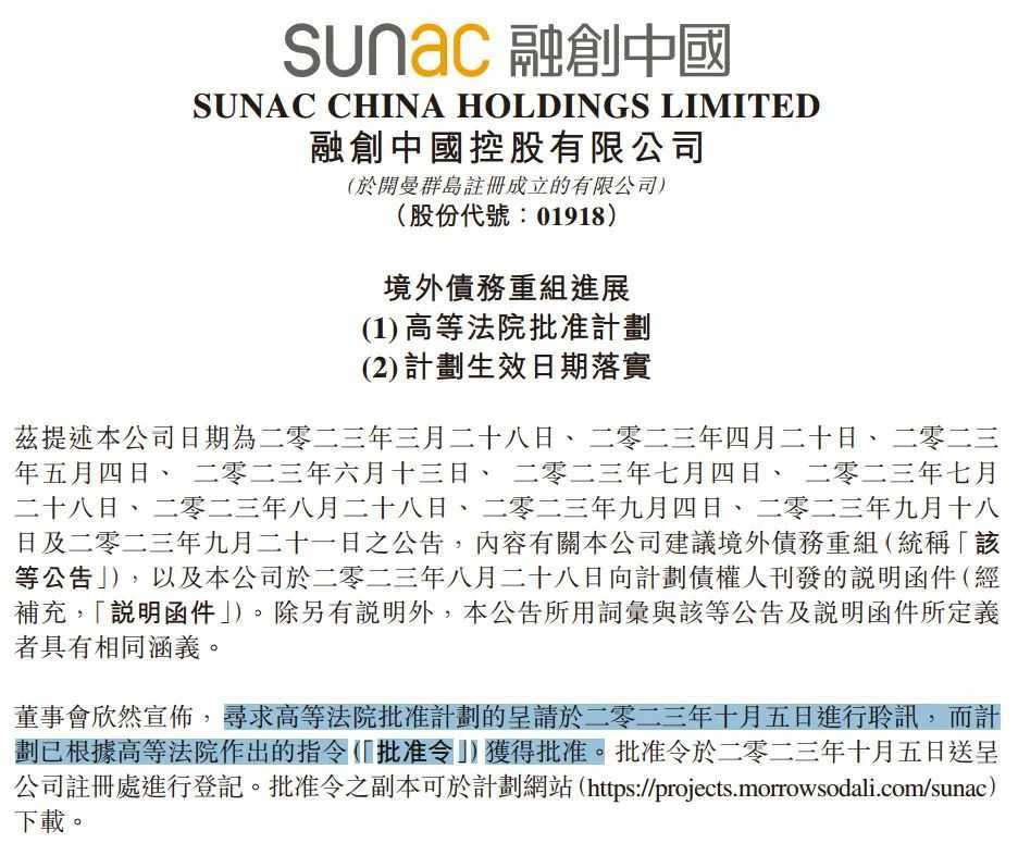 据了解,融创中国的境外债务重组计划此前已获得高票通过,并于9月19日向美国法庭申请第15章认证,以获得对中国香港法庭有关协议安排重组的认可。此次香港法院的批准,标志着融创中国已经跨过了债务重组的重要一关。