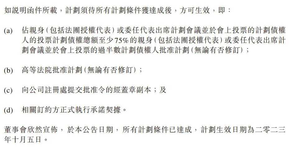 融创中国在公告中表示,所有计划条件已达成,计划生效日期为10月5日。该境外债务重组计划的实施,需要满足多项条件,包括占亲身(包括法团授权代表)或委派代表出席计划会议、投票计划债权总额至少75%的亲身(包括法团授权代表)或委派代表出席计划会议并批准计划、高等法院批准计划、向融创中国注册处提交批准令的经盖章副本及相关订约方正式执行承诺契据等。