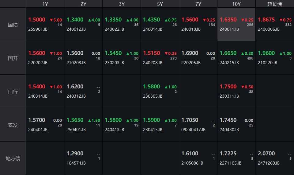 在银行间市场,主要利率债收益率呈现涨跌互现的格局。截至下午16:30,10年期国债活跃券240011的收益率报1.635%,30年期国债活跃券2400006的收益率报1.866%,而10年期国开活跃券240215的收益率则报1.665%。